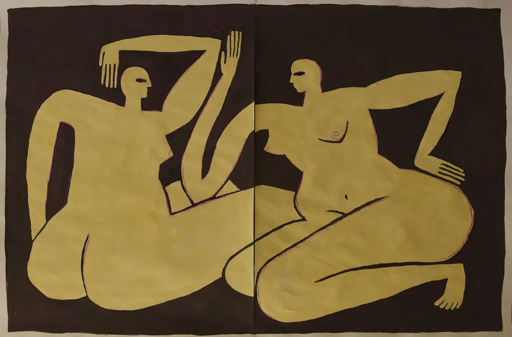 ”Strong outlines are a recurring visual element. I want to incorporate the constraints and expectations that are imposed on us in society, but then break them up with more fluid shapes and colours.”